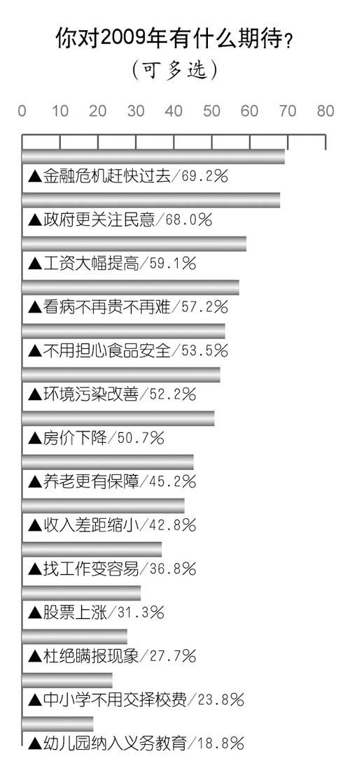 近日,中国青年报社会调查中心通过新浪网,对3714人的调查显示,69.2%的人希望金融危机赶快过去,68.0%的人期待政府更关注民意,59.1%的人盼望工资大幅提高。